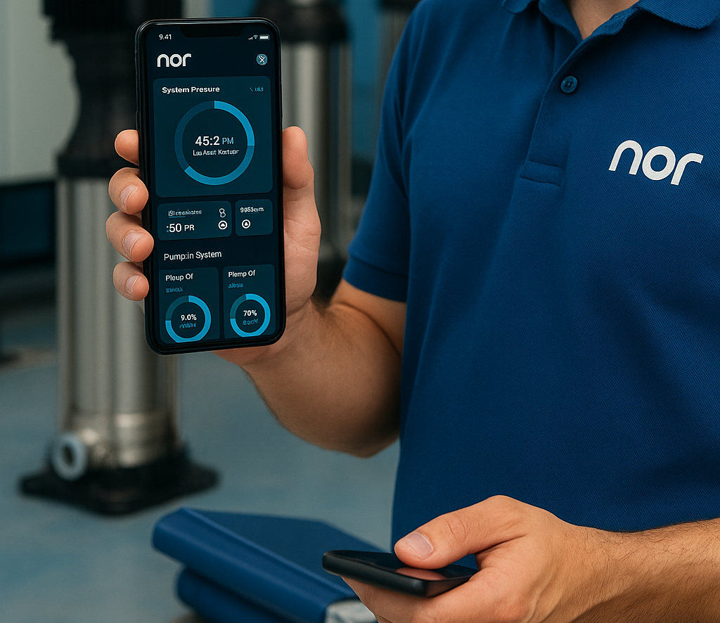 La APP NORCON te permite controlar y monitorizar tus bombas en tiempo real, optimizar el consumo de agua y energía, recibir notificaciones inmediatas ante incidencias y acceder a soporte remoto especializado, todo desde tu móvil de forma simple y segura.